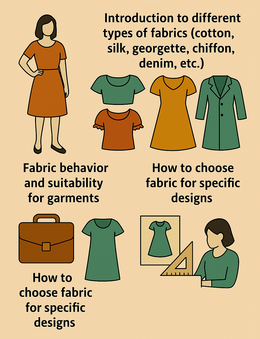Types of fabrics – Cotton, Silk, Georgette, Denim, Crepe, Rayon, etc.